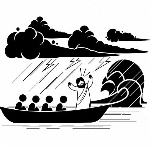 Jesus and His disciples are on a boat when a storm hits. The disciples panic, but Jesus speaks to the storm, and it stops immediately. He reminds them to have faith, not fear.